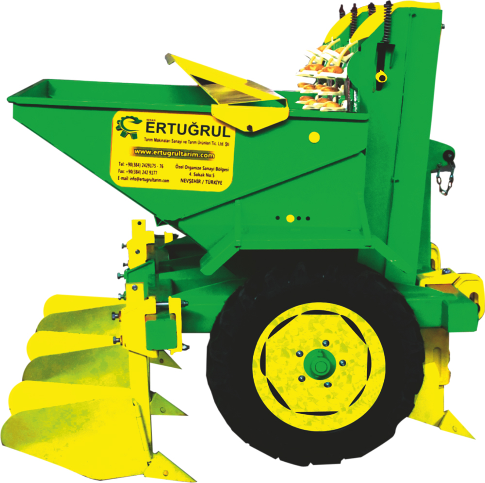 Traktöre 3 askı sistemi ile bağlanan makinemiz, patates düşme mesafesinin ayarını tekerden alır, sıra aralığı 65-75 cm’e ayarlanabilir. Lastik bant üzerine perçinle tutturulmuş taslarla patatesi taslarla alır. Bu tasların patates cinsine göre içine plastik küçük taş takılabilir. Sınıflandırılmış patatesleri üzerine iki işçi çalıştırmak şartıyla en iyi ekebilen makinedir. Dilinmiş patatesleride işçinin yardımıyla ekerek tohum sayısını ikiye katlamamızı sağlar.